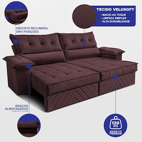 Sofá Retrátil e Reclinável 2,10m com Molas e Espuma D33 Thunder. Velusoft Cama inBox - Vinho