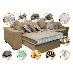 Características: -Encosto Reclinável com 5 posições, almofada do encosto solta composta de 80% fibra siliconada e 20% flocos de espuma e percintas elásticas que proporcionam maior conforto. -Assentos: Retráteis com espumas D33, 208 Molas Ensacadas, uma tripla camada de espumas cobertas por mais uma macia camada de fibra siliconada em seu Pilow TOP, percintas Pneumáticas com feltro para proteger do atrito com as molas. (Extremamente resistente e confortável). -Acomcompanha 8 lindas almofadinhas, sendo 4 na cor do sofá e 4 personalizadas. -Braços: Com 25cm de largura e com espuma D33. -Fixação: Grampos galvanizados -Estrutura de Madeira maciça 100% eucalipto de reflorestamento, produto ecologicamente correto -Pés em PVC