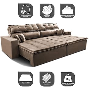 Traga ainda mais modernidade, conforto e elegância para sua sala com o Sofá Retrátil e Reclinável Luxos da Cama inBox. Desenvolvido com uma estrutura interna resistente, sendo feito com espuma D28, Percintas Extra Suport, Tecido Exclusivo Velusoft e Madeira de Eucalipto 100% reflorestada, tudo isso garante um melhor suporte para o conforto, sendo ideal para acomodar você e sua família. Tenha toda essa qualidade e conforto em sua sala. Demais, né? Garanta já o seu Sofá Retrátil e Reclinável Luxos!