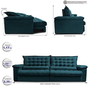 O Sofá Retrátil e Reclinável Big Space, da Linha BIG, oferece charme, conforto e imponência. Possui encostos mega gigantes e assentos maiores que os modelos comuns. Estrutura em madeira maciça 100% eucalipto, assentos com espuma D33, molas ensacadas, molas bonnel, fibra siliconada e percintas Extra Suport. Encostos reclináveis em 5 níveis, almofadas parcialmente removíveis com 80% fibra siliconada e 20% flocos de espuma. Braços com 25cm de largura. Tecido suede Velusoft. Medidas: Altura 1,17m. Profundidade: 1,20m (fechado), 1,75m (aberto). Largura 2,35m. Bipartido (2 módulos). Suporta até 120kg por pessoa. Fácil montagem, sem necessidade de montador. Garantia de 6 meses. Produto artesanal, com possíveis variações nas medidas e tonalidades. Entrega até a porta. Transportadoras não sobem escadas ou elevadores.