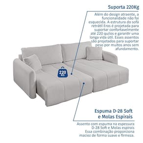 O sofá Eros possui um desenho minimalista, sofisticado e acolhedor que são um convite a desfrutar momentos de relaxamento e a diminuir o ritmo. Seu assento retrátil e extensível em 2 estágios, com molas espirais, espuma D28 e persintas elásticas de excelente qualidade garantem conforto e resistência. As almofadas soltas do encosto são preenchidas com 100% de fibra siliconada, e podem ser encaixadas de diferentes formas para um repouso mais completo. A estrutura é fabricada em eucalipto reflorestado, seco e imunizado e os pés em madeira com acabamento em verniz fosco. Além disso, acompanha 2 almofadas decorativas para compor com ainda mais estilo o ambiente. Acompanha Almofadas extras: 02 Almofada do assento: Fixa Almofada do encosto: Removível Altura do assento até o chão: 45 cm Altura do Encosto: 48 cm Altura dos Pés: 2,5 cm Ambiente Principal: Sala de Estar Bipartida: Sim codigo_ean: 7900288252449 Cor: Cinza Cor do Produto: Cinza Enchimento do Assento: Hyper Soft Estilo de Braço: Braços Redondos Firmeza do Assento: Firme Itens Inclusos: 1 Sofá e 4 Almofadas Largura do Braço: 13 cm Linha ou Coleção: Eros Manual de Especificação Técnica: https://cdn2.madeiramadeira.com.br/atributo/belldecor/3254158-6582-17593667340021.pdf Manual de Montagem e Instalação: https://cdn2.madeiramadeira.com.br/atributo/belldecor/3254157-6582-17593666972322.pdf Marca: Espresso Móveis Material da Corrediça do Sofá: Aço/Metal Material dos Pés: Madeira Eucalipto Montagem Flex: Não Necessita Montagem: Não Nível de Conforto: Firme Origem do Produto: Nacional Peso: 136 kg Pet Friendly: Não Porta Copos: Não Possui Baú: Não Possui Entrada USB: Não Possui Mola: Sim Possui Percintas Elásticas: Sim Possui Pés: 04 Possui Rodízio: Não Profundidade Quando Estendido: 150 cm Quantidade de Estágios do Encosto: 2 Quantidade de Itens: 5 Quantidade de Molas por Assento: 6 Recomendações de Uso, Manutenção e Limpeza: O primeiro passo para limpar qualquer estofado é remover os resídos sólidos com o aspirador de pó. Se tiver derramado algum líquido, remova o excesso com um papel-toalha, sem esfregar, apenas deixando que ele absorva. Em relação a produtos de limpeza, os detergentes e sabões neutros são ideais para a higienização. Na hora de remover manchas, é possível usar alguns artigos específicos, voltados para os tecidos corretos. No que diz respeito às ferramentas, por outro lado, não recomenda-se usar nada muito duro. Dê preferência à escova de cerdas macias e ao pano de microfibra. A água morna é uma boa saída para que a esfregação não precise ser tão forte! Revestimento do Braço: Linho Suporta Até (kg): 220 kg Tecido Predominante: Linho Tipo de Encosto: Regulável Tipo de Mola: Molas Espirais Tipo de Sofá: Sofá Comum