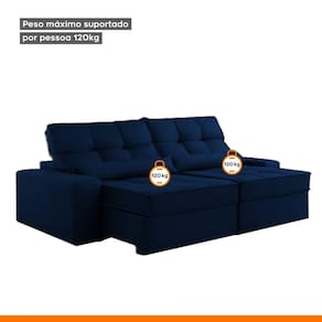 O revestimento em tecido com manta acrílica recebe costura com pesponto duplo, feito com máquinas de ponto eletrônico, proporciona beleza nos desenhos captonê e resistência da costura Acompanha Almofadas extras: Não Almofada do assento: Fixa Almofada do encosto: Fixa Altura do assento até o chão: 57 Altura do Encosto: 54 Altura dos Pés: 2.5 Ambiente Principal: Sala de Estar Complexidade da Montagem: Baixa: pode ser montado por uma pessoa sozinha Cor: Azul Cor do Produto: Azul Densidade do Assento: D-28 Densidade do Encosto: D-18 Enchimento do Assento: Hyper Soft Enchimento do Encosto: Fibra Siliconada Estilo de Braço: Braços Quadrados Firmeza do Assento: Macio Itens Inclusos: 1 Sofá, Kit Ferragens e Manual de Montagem Material dos Pés: Madeira Necessita Montagem: Sim Origem do Produto: Nacional Peso: 105.35 Pet Friendly: Não Possui Percintas Elásticas: Sim Possui Pés: 08 Possui Rodízio: Sim Profundidade Quando Estendido: 180 Recomendações de Uso, Manutenção e Limpeza: A limpeza do revestimento deve ser feita com escova ou tecido de algodão branco levemente umedecidos em água morna, sabão neutro ou produto específico. Não usar produtos corrosivos nem a base de solventes, como: cloro, alvejantes, detergentes, entre outros;Não expor o estofado à luz direta. Mantenha portas e janelas sempre protegidas com cortinas e blackout. A exposição contínua à radiação da luz, danifica o revestimento, apodrecendo os fios, trincando a superfície e desbotando as cores;Não lavar o revestimento das almofadas pois pode desfiá-las, abrindo as costuras;Não utilizar o estofado para fins diferentes do que foi projetado: ficar em pé, pular, arrastar, sentar nos braços, peso na caixa traseira, entre outros tipos de ações que poderão danificar o produto. Resistente à Chuva: Não Revestimento do Braço: Veludo Rodízio com Trava: Não Sistema de Montagem: Sim Suporta Até (kg): 120 Tecido Predominante: Veludo Tipo de Encosto: Regulável Tipo de Mola: Molas Espirais Ean: 7908551959002