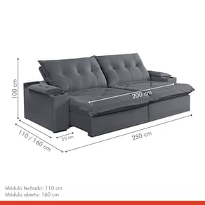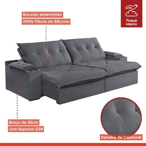 Sofás são fundamentais para que a sua sala fique mais receptiva, tanto para receber as visitas quanto para curtir aquele momento relax em frente à televisão. Por isso, o Sofá M163 é uma ótima pedida para entrar no seu time de móveis. Estruturado em madeira reflorestada, ele possui assento retrátil - o que facilita na hora de esticar as pernas para descansar - e revestimento em Veludo, agregando um valor estético incrível para a sua casa. Já a cor ajuda a compor a paleta de cores do espaço sem dificuldades, uma vez que é simples de inserir em qualquer ambiente. Acompanha Almofadas extras: Não Almofada do assento: Fixa Almofada do encosto: Fixa Altura do assento até o chão: 64 Altura do Encosto: 37 Altura dos Pés: 2.5 Ambiente Principal: Sala de Estar Complexidade da Montagem: Baixa: pode ser montado por uma pessoa sozinha Cor: Veludo/Cinza Escuro Cor do Produto: Veludo/Cinza Escuro Densidade do Assento: D-28 Densidade do Encosto: D-18 Enchimento do Assento: Espuma Enchimento do Encosto: Fibra Siliconada Estilo de Braço: Braços Quadrados Firmeza do Assento: Firme Informações Complementares: * Pillow do braço regulável* Entradas USB e USBC para carregar celular e outros dispositivos eletrônicos. Itens Inclusos: 1 Sofá e Manual de Instrução. Material dos Pés: Madeira Necessita Montagem: Sim Origem do Produto: Nacional Peso: 109.5 Pet Friendly: Não Possui Percintas Elásticas: Sim Possui Pés: 08 Possui Rodízio: Sim Profundidade Quando Estendido: 160 Recomendações de Uso, Manutenção e Limpeza: Não use produtos químicos, eles podem danificar o revestimento; Resistente à Chuva: Não Revestimento do Braço: Veludo Rodízio com Trava: Não Sistema de Montagem: Encaixe Suporta Até (kg): 120 Tecido Predominante: Veludo Tipo de Encosto: Regulável Tipo de Mola: Molas Bonnel Ean: 7909903408094