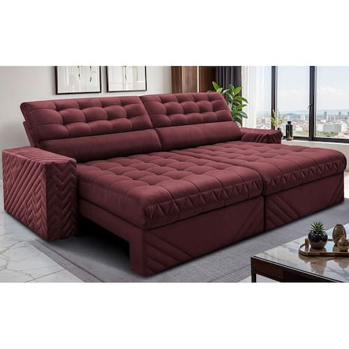 Sofá Retrátil e Reclinável 2,50m de Molas Ensacadas Max Spring Velusoft Cama inBoxConforto premium, preço acessível e design único que transforma sua sala. O Sofá Retrátil e Reclinável Max Spring é a escolha perfeita para quem busca conforto absoluto e durabilidade premium. Combinando a espuma de alta qualidade com a sustentação das Molas Ensacadas e Molas Bonnel, este modelo oferece uma experiência única de relaxamento. Cada assento e encosto se adapta ao corpo de forma inteligente, proporcionando apoio anatômico e eliminando a sensação de afundamento ou desconforto.Invista nessas tecnologias do Sofá Retrátil e Reclinável Max Spring:ConfortTech: Tripla Camada de Conforto InteligenteO Sofá Max Spring conta com o sistema exclusivo ConfortTech, que combina Molas Ensacadas, Espuma D33 com Tecnologia ThermoGel e Fibra Siliconada. Essa união garante sustentação anatômica, frescor constante e maciez duradoura. Um sofá pensado para acompanhar sua rotina e transformar cada momento em descanso de alto padrão.SoftBlend 3D: Design que impressionaO acabamento exclusivo SoftBlend 3D traz sofisticação incomparável ao sofá. Seus bordados pantográficos em alto-relevo, aliados ao matelassê de manta de fibra siliconada compactada com espuma soft, criam um visual elegante e aconchegante. Cada detalhe foi pensado para adicionar personalidade e transformar sua sala em um ambiente moderno, confortável e cheio de charme.Estrutura completa e duradoura- Assento Retrátil: Espuma D33 com ThermoGel, molas ensacadas e bonnel, fibra siliconada e percintas Extra Support. Combinação que garante conforto imediato, molejo ideal e resistência superior.- Encosto Reclinável: Reclinável em 5 posições, com almofadas parcialmente removíveis em 80% fibra siliconada e 20% flocos de espuma, oferecendo suporte ergonômico e maciez envolvente.- Braços: Madeira maciça de eucalipto, 25 cm de largura e acabamento SoftBlend 3D para unir resistência e sofisticação.- Estrutura: Madeira maciça de reflorestamento com grampos galvanizados, reforço que garante firmeza e longa durabilidade.- Tecido: Exclusivo Suede Velusoft, toque macio e aconchegante, perfeito para qualquer decoração.Dimensões do Sofá Retrátil MontadoAltura: 0,97mProfundidade fechado: 0,86mProfundidade aberto: 1,45mLargura: 2,50mMedidas disponíveis: 2,30m, 2,50m, 2,70m e 3,00mCores disponíveis: Azul, Bege, Café, Castor, Cinza, Petróleo, Preto, Vermelho e VinhoPor que escolher o Sofá Retrátil e Reclinável Max Spring?- Não sinta a estrutura com a nossa exclusiva tecnologia ConfortTech que combina espuma D33 com ThermoGel, molas ensacadas e molas bonnel para oferecer conforto absoluto.- Assento Retrátil confortável por muito mais tempo: não afunda, mantém a qualidade e o suporte mesmo após anos de uso.- Conforto ergonômico de verdade: encosto reclinável em 5 posições mais almofadas de fibra siliconada que se moldam ao corpo.- Feito para durar: estrutura em madeira maciça de reflorestamento, resistente ao uso do dia a dia.- Beleza que transforma sua sala: acabamento exclusivo em SoftBlend 3D com tecido Velusoft, união perfeita de sofisticação e aconchego.- Custo-benefício acessível: um sofá retrátil e reclinável com tecnologias de modelos premium por um preço direto de fábrica.Informações extras- Produto já vai montado, não acompanha rodízios. - Peso suportado: até 120kg por pessoa- Garantia: 6 meses (3 meses de garantia legal + 3 meses de garantia da Cama inBox)- Entra facilmente em portas, corredores e elevadores acima de 65 cm de larguraInformações importantes- As tonalidades dos tecidos podem variar de acordo com o lote de produção e também pela resolução da tela do seu monitor ou celular.- Por se tratar de um produto artesanal, podem ocorrer pequenas variações nas medidas de largura, altura ou profundidade.- Objetos de decoração utilizados nas fotos não acompanham o produto.- Nossos produtos seguem um padrão de fabricação, não sendo possível realizar personalizações.- A Cama inBox realiza a entrega até a porta de entrada (casas) ou portaria (prédios). A partir desse ponto, o transporte até o local de uso é de responsabilidade do cliente. Importante: as transportadoras não sobem escadas ou elevadores. Caso ocorram danos durante esse deslocamento interno, a responsabilidade será do cliente.Garanta agora o Sofá Retrátil e Reclinável de Molas Ensacadas Max Spring e descubra que é possível ter o conforto de um sofá premium com preço de fábrica.