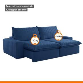 O revestimento em tecido com manta acrílica recebe costura com pesponto duplo, feito com máquinas de ponto eletrônico, proporciona beleza nos desenhos e resistência da costura Acompanha Almofadas extras: Não Almofada do assento: Fixa Almofada do encosto: Fixa Altura do assento até o chão: 56 Altura do Encosto: 60 Altura dos Pés: 2.5 Ambiente Principal: Sala de Estar Complexidade da Montagem: Baixa: pode ser montado por uma pessoa sozinha Cor: Azul Cor do Produto: Azul Densidade do Assento: D-28 Densidade do Encosto: D-18 Enchimento do Assento: Hyper Soft Enchimento do Encosto: Fibra Siliconada Estilo de Braço: Braços Quadrados Firmeza do Assento: Macio Itens Inclusos: 1 Sofá, Kit Ferragens e Manual de Montagem Material dos Pés: Madeira Necessita Montagem: Sim Origem do Produto: Nacional Peso: 132.6 Pet Friendly: Não Possui Percintas Elásticas: Sim Possui Pés: 08 Possui Rodízio: Sim Profundidade Quando Estendido: 180 Recomendações de Uso, Manutenção e Limpeza: A limpeza do revestimento deve ser feita com escova ou tecido de algodão branco levemente umedecidos em água morna, sabão neutro ou produto específico. Não usar produtos corrosivos nem a base de solventes, como: cloro, alvejantes, detergentes, entre outros;Não expor o estofado à luz direta. Mantenha portas e janelas sempre protegidas com cortinas e blackout. A exposição contínua à radiação da luz, danifica o revestimento, apodrecendo os fios, trincando a superfície e desbotando as cores;Não lavar o revestimento das almofadas pois pode desfiá-las, abrindo as costuras;Não utilizar o estofado para fins diferentes do que foi projetado: ficar em pé, pular, arrastar, sentar nos braços, peso na caixa traseira, entre outros tipos de ações que poderão danificar o produto. Resistente à Chuva: Não Revestimento do Braço: Veludo Rodízio com Trava: Não Sistema de Montagem: Sim Suporta Até (kg): 120 Tecido Predominante: Veludo Tipo de Encosto: Regulável Tipo de Mola: Molas Espirais Ean: 7908551958883