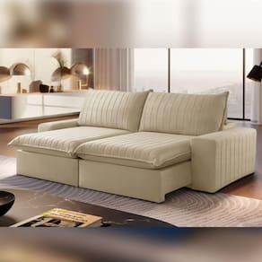 O revestimento em tecido com manta acrílica recebe costura com pesponto duplo, feito com máquinas de ponto eletrônico, proporciona beleza nos desenhos e resistência da costura Acompanha Almofadas extras: Não Almofada do assento: Fixa Almofada do encosto: Fixa Altura do assento até o chão: 56 Altura do Encosto: 60 Altura dos Pés: 2.5 Ambiente Principal: Sala de Estar Complexidade da Montagem: Baixa: pode ser montado por uma pessoa sozinha Cor: Bege Cor do Produto: Bege Densidade do Assento: D-28 Densidade do Encosto: D-18 Enchimento do Assento: Hyper Soft Enchimento do Encosto: Fibra Siliconada Estilo de Braço: Braços Quadrados Firmeza do Assento: Macio Itens Inclusos: 1 Sofá, Kit Ferragens e Manual de Montagem Material dos Pés: Madeira Necessita Montagem: Sim Origem do Produto: Nacional Peso: 132.6 Pet Friendly: Não Possui Percintas Elásticas: Sim Possui Pés: 08 Possui Rodízio: Sim Profundidade Quando Estendido: 180 Recomendações de Uso, Manutenção e Limpeza: A limpeza do revestimento deve ser feita com escova ou tecido de algodão branco levemente umedecidos em água morna, sabão neutro ou produto específico. Não usar produtos corrosivos nem a base de solventes, como: cloro, alvejantes, detergentes, entre outros;Não expor o estofado à luz direta. Mantenha portas e janelas sempre protegidas com cortinas e blackout. A exposição contínua à radiação da luz, danifica o revestimento, apodrecendo os fios, trincando a superfície e desbotando as cores;Não lavar o revestimento das almofadas pois pode desfiá-las, abrindo as costuras;Não utilizar o estofado para fins diferentes do que foi projetado: ficar em pé, pular, arrastar, sentar nos braços, peso na caixa traseira, entre outros tipos de ações que poderão danificar o produto. Resistente à Chuva: Não Revestimento do Braço: Veludo Rodízio com Trava: Não Sistema de Montagem: Sim Suporta Até (kg): 120 Tecido Predominante: Veludo Tipo de Encosto: Regulável Tipo de Mola: Molas Espirais Ean: 7908551958869