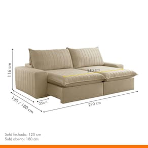 O assento de pillow com espuma elástica e costura matelado. Possui mecanismo retrátil em aço que permite abertura do sofá para seu bem-estar.