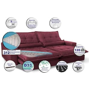 Sofa Retrátil E Reclinável 2,92m Com Molas Ensacadas Cama Inbox Soft Tecido Suede Vinho - Blush