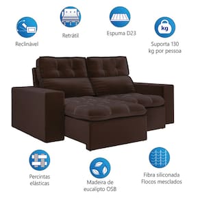 MEDIDAS: A = 103 cm L = 200 cm P = 117 cm / 170 cm (Aberto) PESO: 79Kg PESO SUPORTADO: 130 Kg Por Assento MODELO: Sofá Retrátil e Reclinável 2m 3 Lugares Petrópolis Veludo MARCA: Mamflex TECIDO: Veludo PERCINTAS: Elásticas MATERIAL DA ESTRUTURA: Madeira de Eucalipto MATERIAL DO ASSENTO: Espuma DENSIDADE DE ESPUMA DO ASSENTO: D23 QUANTIDADE DE LUGARES: 3 MATERIAL DO ENCOSTO: Almofadas com Fibras e Flocos POSSUI ENCOSTO REMOVÍVEL: Sim BRAÇOS: Espuma DENSIDADE DE ESPUMA DO BRAÇO: D16 TIPO DE SOFÁ: Retrátil e Reclinável RECLINÁVEL: 4 níveis PÉS: 4 unidades, em PVC POSSUI RODÍZIOS: Sim, 4 unidades VALE A PENA SABER: A tonalidade de cor pode variar de acordo com o lote do fabricante. CONTEÚDO DA EMBALAGEM: 1 Volume GARANTIA: 3 Meses