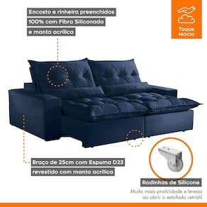 Possui também possui mecanismo retrátil em aço que permite abertura do sofá para sua maior comodidade. O revestimento em tecido com manta acrílica recebe costura com pesponto duplo, feito com máquinas de ponto eletrônico, proporciona beleza nos desenhos captonê e resistência da costura.