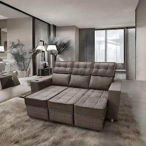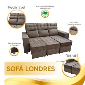 Sofá Retrátil E Reclinável 3 Lugares Londres 1.90cm Com Molas Suede Speciale Home Marrom O sofa Londres e retratil e reclinavel, ideal para quem busca conforto. Possui estrutura de madeira e assento e encosto revestidos em tecido macio, que proporciona uma agradavel sensacao ao toque. E reclinavel, o que permite ajustar a posicao de acordo com as necessidades, e retratil, o que facilita o manuseio. Caracteristicas do Produto: Material da Estrutura: Madeira de eucalipto (Reflorestamento) Assento em Espuma: D-20 Encosto em Espuma: Fibra Siliconada com Flocos Bracos em Espuma: D-12 Possui 4 Pes de PVC com pintura cromada. Sustentacao do encosto e assento com Percintas elasticas. Bracos com chapa de mdf Fixacao com grampos Galvanizados Encosto Removivel Mecanismo Retratil no assento Catraca no encosto Rodizios em gel