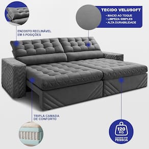 Sofá Retrátil E Reclinável 3,00m Molas Ensacadas Max Spring. Velusoft Cama Inbox Cinza