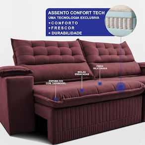 - Encosto Reclinável: Reclinável em 5 posições, com almofadas compostas por 80% fibra siliconada e 20% flocos de espuma, oferecendo suporte ergonômico e maciez envolvente.