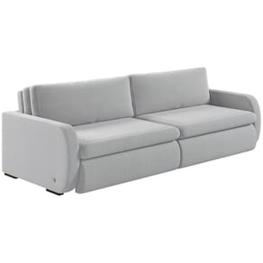 Produto feito com madeira de reflorestamento e revestido com Linho 100% poliéster. No assento, além da espuma D28 temos também manta de fibra de silicone. O encosto possui enchimento de fibra de silicone. Possui pés de madeira maciça. Produto Montado: Sim Acompanha Almofadas extras: Não Almofada do assento: Removível Almofada do encosto: Removível Altura do assento até o chão: 44.0000 Altura do Encosto: 43 cm Ambiente Principal: Sala de Estar codigo_ean: 7900288223555 Complexidade da Montagem: Baixa: pode ser montado por uma pessoa sozinha Cor: Gelo Cor do Produto: Gelo Estilo de Braço: Braços Redondos Informações Complementares: Pillow nos assentos com 16cm de Espuma Contínua S/A D28 Supersoft; Assentos retráteis com mecanismo metálico + molas de aço; Encostos reclináveis em 3 posições diferentes + almofadas soltas com enchimento de fibra de silicone; Rodinhas de silicone para ap Itens Inclusos: 1 Sofá e Kit Ferragens Linha ou Coleção: Sunset Marca: Estofart Material dos Pés: Madeira Montagem Flex: Não Necessita Montagem: Sim Origem do Produto: Nacional Peso: 101 kg Pet Friendly: Não Possui Percintas Elásticas: Sim Possui Pés: 08 Possui Rodízio: Sim Profundidade Quando Estendido: 155 cm Profundidade quando extendido: 155.0000 Recomendações de Uso, Manutenção e Limpeza: - Não expor ao sol ou fonte de calor; Não utilizar produtos de limpeza como detergente, álcool, solventes, ou produtos químicos; Para a limpeza, utilizar pano umedecido em água, sabão neutro e escova de cerdas macias, deixando secar a sombra. Em caso de excesso de poeira, usar aspirador de pó; Não provocar tensões desproporcionais no assento do sofá, provocadas pro quedas ou pulos; Evitar contatos com animais; Preservar o produto de objetos aquecidos ou pontiagudos; Mantê-lo em local arejado; Não arrastar o sofá pelos braços; Transportar com o máximo de cautela. Rodízio com Trava: Não Sistema de Montagem: Parafusação dos pés na base do sofá e união entre os módulos por engate metálico Suporta Até (kg): 100 kg Tecido Predominante: Linho Tipo de Encosto: Regulável Tipo de Mola: Molas Espirais Tipo de Sofá: Sofá Cama Marca: Não Informado