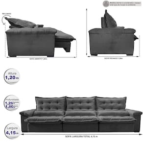 Sofá Retrátil e Reclinável 4,15m Cama inBox Big Fresh. com SoftGel D40 Velupluma - Cinza