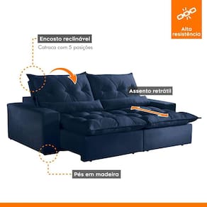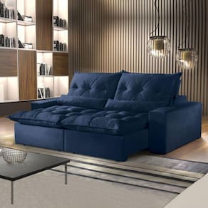 Estofado Retrátil e Reclinável Avalon é um modelo com poucos detalhes e muita autenticidade. A estrutura de madeira maciça de eucalipto seca e imunizada segue um rigoroso procedimento de montagem. Os revestimentos internos são de "Pet Fon", um produto sintético, resistente e durável. O encosto com enchimento em fibra siliconada para seu bem-estar. Acompanha almofada rinheira preenchida com fibra siliconada. Para escolher a melhor comodidade a catraca é reclinável com cinco estágios. O assento de pillow com espuma elástica certificada, medindo 18 cm de altura. A base do assento com molas espirais e percinta elástica de alta resistência permite um acolhimento confortável para relaxar. Possui também possui mecanismo retrátil em aço que permite abertura do sofá para sua maior comodidade. O revestimento em tecido com manta acrílica recebe costura com pesponto duplo, feito com máquinas de ponto eletrônico, proporciona beleza nos desenhos captonê e resistência da costura. O braço é composto por espuma D23 revestido com manta acrílica Acompanha Almofadas extras: 02 Almofada do assento: Fixa Almofada do encosto: Fixa Altura do assento até o chão: 51 Altura do Encosto: 62 Altura dos Pés: 2.5 Ambiente Principal: Sala de Estar Complexidade da Montagem: Média: pode ser montado por mais de uma pessoa e/ou necessite de maior conhecimento para montagem Cor: Veludo Marinho Cor do Produto: Veludo Marinho Densidade do Assento: D-18 Densidade do Encosto: D-18 Enchimento do Assento: Fibra Siliconada Enchimento do Encosto: Fibra Siliconada Estilo de Braço: Braços Quadrados Firmeza do Assento: Macio Informações Complementares: Itens Inclusos: 1 Sofá e Manual de Instruções Largura do Sofá Maior: Linha ou Coleção: Manual de Especificação Técnica: Manual de Montagem e Instalação: Material dos Pés: Madeira Montagem Flex: Necessita Montagem: Sim Origem do Produto: Nacional Peso: 115.51 Pet Friendly: Não Possui Percintas Elásticas: Sim Possui Pés: 08 Possui Rodízio: Sim Profundidade Quando Estendido: 180 Recomendações de Uso, Manutenção e Limpeza: A limpeza do revestimento deve ser feita com escova ou tecido de algodão branco levemente umedecidos em água morna, sabão neutro ou produto específico. Não usar produtos corrosivos nem a base de solventes, como: cloro, alvejantes, detergentes, entre outros;Não expor o estofado à luz direta. Mantenha portas e janelas sempre protegidas com cortinas e blackout. A exposição contínua à radiação da luz, danifica o revestimento, apodrecendo os fios, trincando a superfície e desbotando as cores;Não lavar o revestimento das almofadas pois pode desfiá-las, abrindo as costuras;Não utilizar o estofado para fins diferentes do que foi projetado: ficar em pé, pular, arrastar, sentar nos braços, peso na caixa traseira, entre outros tipos de ações que poderão danificar o produto. Resistente à Chuva: Revestimento do Braço: Veludo Rodízio com Trava: Não Sistema de Montagem: Parafusos e Encaixe Suporta Até (kg): 120 Tecido Predominante: Poliéster Tipo de Encosto: Regulável Tipo de Madeira Maciça da Estrutura: Tipo de Mola: Molas Espirais