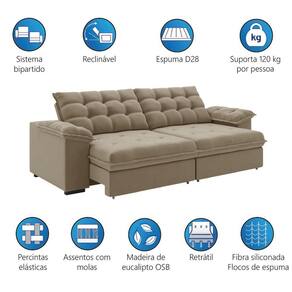 Você busca um sofá confortável, bonito e espaçoso? O Sofá Retrátil e Reclinável Palermo é a escolha ideal! Com design sofisticado que se adapta a qualquer ambiente, oferece máximo conforto graças às Molas Bonnel, ao tecido Slim de toque macio e às percintas elásticas que garantem sustentação e flexibilidade. Sua estrutura conta com pés em PVC e rodízios de silicone, suportando até 120 kg por pessoa. O modelo é bipartido, o que facilita a movimentação em corredores e portas estreitas, tornando o e a montagem muito mais práticos. Além disso, o encosto removível também contribui para essa facilidade. Ideal para momentos de descanso ou para receber a família e os amigos!
