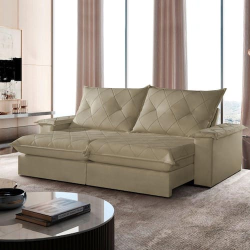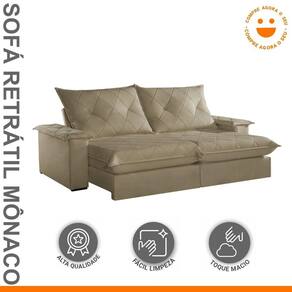 Experimente o máximo em conforto e estilo com nosso sofá retrátil e reclinável, o epítome do luxo moderno para sua sala de estar. Este sofá é mais do que um simples móvel; é um convite para o relaxamento supremo. Com seu design elegante e estofamento de alta qualidade, ele não só adiciona um toque de sofisticação ao seu espaço, mas também oferece a versatilidade de se ajustar às suas necessidades. Recline-se e relaxe após um longo dia de trabalho, ou estenda o sofá para receber seus convidados com conforto e hospitalidade. Produto Montado: Sim Acompanha Almofadas extras: Não Almofada do assento: Fixa Almofada do encosto: Removível Altura do assento até o chão: 50.0000 Altura do Encosto: 64 cm Altura dos Pés: 2,5 cm Ambiente Principal: Sala de Estar codigo_ean: 7909903646533 Complexidade da Montagem: Baixa: pode ser montado por uma pessoa sozinha Cor: Jolie/Bege Cor do Produto: Jolie/Bege Densidade do Assento: D-26 Enchimento do Assento: Espuma Enchimento do Encosto: Fibra Siliconada Firmeza do Assento: Firme Itens Inclusos: 1 Sofá e manual de instrução. Linha ou Coleção: Mônaco Manual de Montagem e Instalação: https://product-hub-prd.madeiramadeira.com.br/903906/documents/41977da2-e180-4596-879b-7ba4b4f2230919018721.pdf Material dos Pés: Madeira Montagem Flex: Não Necessita Montagem: Sim Peso: 110 kg Pet Friendly: Não Possui Baú: Não Possui Percintas Elásticas: Sim Possui Pés: 08 Possui Rodízio: Sim Profundidade Quando Estendido: 175 cm Recomendações de Uso, Manutenção e Limpeza: Para limpar, utilize pano seco ou papel absorvente. Não armazenar em local úmido. Não usar produtos químicos como detergente, cloro, alvejantes entre outros. Evitar exposição a luz solar direta por longos períodos. O consumidor perderá total garantia se for detectado dano no produto causadas por animais! Revestimento do Braço: Espuma , manta acrilica Rodízio com Trava: Não Sistema de Montagem: Encaixe. Suporta Até (kg): 120 kg Tecido Predominante: Veludo Tipo de Encosto: Regulável