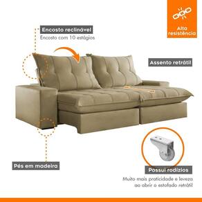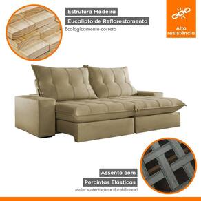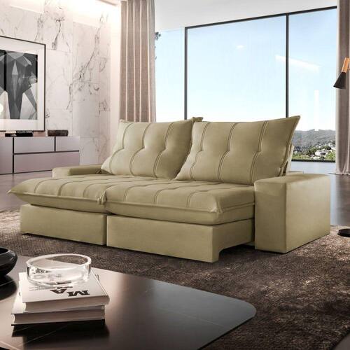 Experimente o máximo em conforto e estilo com nosso sofá retrátil e reclinável, o epítome do luxo moderno para sua sala de estar. Este sofá é mais do que um simples móvel; é um convite para o relaxamento supremo. Com seu design elegante e estofamento de alta qualidade, ele não só adiciona um toque de sofisticação ao seu espaço, mas também oferece a versatilidade de se ajustar às suas necessidades. Recline-se e relaxe após um longo dia de trabalho, ou estenda o sofá para receber seus convidados com conforto e hospitalidade. Produto Montado: Sim Acompanha Almofadas extras: Não Almofada do assento: Fixa Almofada do encosto: Removível Altura do assento até o chão: 50.0000 Altura do Encosto: 64 cm Altura dos Pés: 2,5 cm Ambiente Principal: Sala de Estar codigo_ean: 7909903647004 Complexidade da Montagem: Baixa: pode ser montado por uma pessoa sozinha Cor: Jolie/Bege Cor do Produto: Jolie/Bege Densidade do Assento: D-26 Enchimento do Assento: Espuma Enchimento do Encosto: Fibra Siliconada Firmeza do Assento: Firme Itens Inclusos: 1 Sofá e manual de instrução. Linha ou Coleção: Porto Manual de Montagem e Instalação: https://product-hub-prd.madeiramadeira.com.br/903953/documents/37bd6fb9-544b-42fe-935f-6b9da61e631419019171.pdf Material dos Pés: Madeira Montagem Flex: Não Necessita Montagem: Sim Peso: 110 kg Pet Friendly: Não Possui Baú: Não Possui Percintas Elásticas: Sim Possui Pés: 08 Possui Rodízio: Sim Profundidade Quando Estendido: 175 cm Recomendações de Uso, Manutenção e Limpeza: Para limpar, utilize pano seco ou papel absorvente. Não armazenar em local úmido. Não usar produtos químicos como detergente, cloro, alvejantes entre outros. Evitar exposição a luz solar direta por longos períodos. O consumidor perderá total garantia se for detectado dano no produto causadas por animais! Revestimento do Braço: Espuma , manta acrilica Rodízio com Trava: Não Sistema de Montagem: Encaixe. Suporta Até (kg): 120 kg Tecido Predominante: Veludo Tipo de Encosto: Regulável