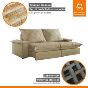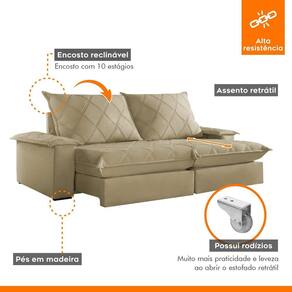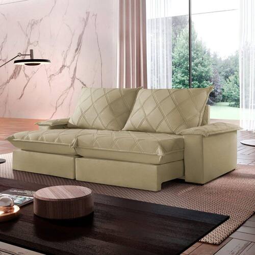 Experimente o máximo em conforto e estilo com nosso sofá retrátil e reclinável, o epítome do luxo moderno para sua sala de estar. Este sofá é mais do que um simples móvel; é um convite para o relaxamento supremo. Com seu design elegante e estofamento de alta qualidade, ele não só adiciona um toque de sofisticação ao seu espaço, mas também oferece a versatilidade de se ajustar às suas necessidades. Recline-se e relaxe após um longo dia de trabalho, ou estenda o sofá para receber seus convidados com conforto e hospitalidade. Produto Montado: Sim Acompanha Almofadas extras: Não Almofada do assento: Fixa Almofada do encosto: Removível Altura do assento até o chão: 50.0000 Altura do Encosto: 64 cm Altura dos Pés: 2,5 cm Ambiente Principal: Sala de Estar codigo_ean: 7909903646823 Complexidade da Montagem: Baixa: pode ser montado por uma pessoa sozinha Cor: Jolie/Bege Cor do Produto: Jolie/Bege Densidade do Assento: D-26 Enchimento do Assento: Espuma Enchimento do Encosto: Fibra Siliconada Firmeza do Assento: Firme Itens Inclusos: 1 Sofá e manual de instrução. Linha ou Coleção: Merlot Manual de Montagem e Instalação: https://product-hub-prd.madeiramadeira.com.br/903935/documents/00c4ece9-33c1-40ba-a535-189fe03e35d619019631.pdf Material dos Pés: Madeira Montagem Flex: Não Necessita Montagem: Sim Peso: 117 kg Pet Friendly: Não Possui Baú: Não Possui Percintas Elásticas: Sim Possui Pés: 08 Possui Rodízio: Sim Profundidade Quando Estendido: 175 cm Recomendações de Uso, Manutenção e Limpeza: Para limpar, utilize pano seco ou papel absorvente. Não armazenar em local úmido. Não usar produtos químicos como detergente, cloro, alvejantes entre outros. Evitar exposição a luz solar direta por longos períodos. O consumidor perderá total garantia se for detectado dano no produto causadas por animais! Revestimento do Braço: Espuma , manta acrilica Rodízio com Trava: Não Sistema de Montagem: Encaixe. Suporta Até (kg): 120 kg Tecido Predominante: Veludo Tipo de Encosto: Regulável