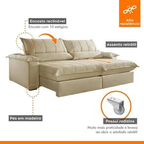 Experimente o máximo em conforto e estilo com nosso sofá retrátil e reclinável, o epítome do luxo moderno para sua sala de estar. Este sofá é mais do que um simples móvel; é um convite para o relaxamento supremo. Com seu design elegante e estofamento de alta qualidade, ele não só adiciona um toque de sofisticação ao seu espaço, mas também oferece a versatilidade de se ajustar às suas necessidades. Recline-se e relaxe após um longo dia de trabalho, ou estenda o sofá para receber seus convidados com conforto e hospitalidade. Acompanha Almofadas extras: Não Almofada do assento: Fixa Almofada do encosto: Removível Altura do assento até o chão: 50 cm Altura do Encosto: 64 cm Altura dos Pés: 2,5 cm Ambiente Principal: Sala de Estar Complexidade da Montagem: Baixa: pode ser montado por uma pessoa sozinha Cor: Veludo Jolie/Bege Cor do Produto: Veludo Jolie/Bege Densidade do Assento: D-26 Densidade do Encosto: D-18 Enchimento do Assento: Espuma Enchimento do Encosto: Fibra Siliconada Estilo de Braço: Braços Quadrados Firmeza do Assento: Firme Itens Inclusos: 1 Sofá e manual de instrução. Linha ou Coleção: Porto Bello Material dos Pés: Madeira Montagem Flex: Não Necessita Montagem: Sim Nível de Conforto: Firme e Macio Peso: 116,32 kg Pet Friendly: Não Possui Baú: Não Possui Percintas Elásticas: Sim Possui Pés: 08 Possui Rodízio: Sim Profundidade Quando Estendido: 175 cm Recomendações de Uso, Manutenção e Limpeza: Para limpar, utilize pano seco ou papel absorvente. Não armazenar em local úmido. Não usar produtos químicos como detergente, cloro, alvejantes entre outros. Evitar exposição a luz solar direta por longos períodos. O consumidor perderá total garantia se for detectado dano no produto causadas por animais! Revestimento do Braço: Fibra siliconada Rodízio com Trava: Não Sistema de Montagem: Encaixe. Suporta Até (kg): 120 kg Tecido Predominante: Veludo Tipo de Encosto: Regulável Tipo de Mola: Molas Ensacadas (Molas ensacadas)