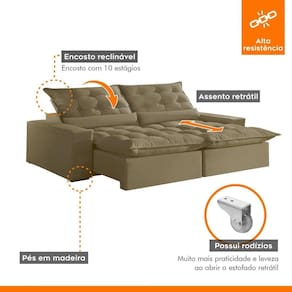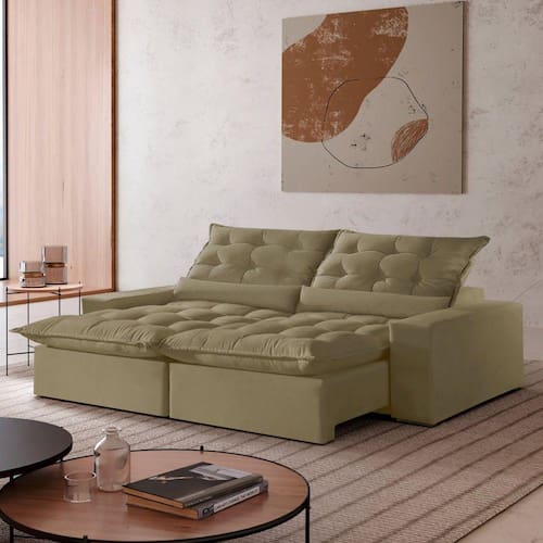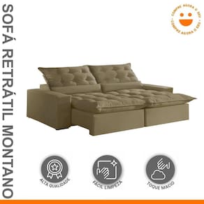 Experimente o máximo em conforto e estilo com nosso sofá retrátil e reclinável, o epítome do luxo moderno para sua sala de estar. Este sofá é mais do que um simples móvel; é um convite para o relaxamento supremo. Com seu design elegante e estofamento de alta qualidade, ele não só adiciona um toque de sofisticação ao seu espaço, mas também oferece a versatilidade de se ajustar às suas necessidades. Recline-se e relaxe após um longo dia de trabalho, ou estenda o sofá para receber seus convidados com conforto e hospitalidade. Produto Montado: Sim Acompanha Almofadas extras: Não Almofada do assento: Fixa Almofada do encosto: Removível Altura do assento até o chão: 50.0000 Altura do Encosto: 68 cm Altura dos Pés: 2,5 cm Ambiente Principal: Sala de Estar codigo_ean: 7909903646281 Complexidade da Montagem: Baixa: pode ser montado por uma pessoa sozinha Cor: Veludo Jolie/Bege Cor do Produto: Veludo Jolie/Bege Densidade do Assento: D-28 Enchimento do Assento: Espuma Enchimento do Encosto: Fibra Siliconada Firmeza do Assento: Firme Itens Inclusos: 1 Sofá e manual de instrução. Linha ou Coleção: Montano Manual de Montagem e Instalação: https://product-hub-prd.madeiramadeira.com.br/903881/documents/100111bf-dfe9-4b59-adc3-3432b4eed9a319019741.pdf Material dos Pés: Madeira Montagem Flex: Não Necessita Montagem: Sim Peso: 118 kg Pet Friendly: Não Possui Baú: Não Possui Percintas Elásticas: Sim Possui Pés: 08 Possui Rodízio: Sim Profundidade Quando Estendido: 180 cm Recomendações de Uso, Manutenção e Limpeza: Para limpar, utilize pano seco ou papel absorvente. Não armazenar em local úmido. Não usar produtos químicos como detergente, cloro, alvejantes entre outros. Evitar exposição a luz solar direta por longos períodos. O consumidor perderá total garantia se for detectado dano no produto causadas por animais! Revestimento do Braço: Espuma , manta acrilica Rodízio com Trava: Não Sistema de Montagem: Encaixe. Suporta Até (kg): 120 kg Tecido Predominante: Veludo Tipo de Encosto: Regulável