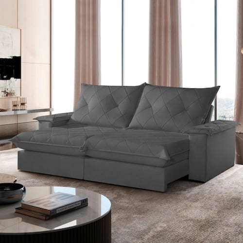 Experimente o máximo em conforto e estilo com nosso sofá retrátil e reclinável, o epítome do luxo moderno para sua sala de estar. Este sofá é mais do que um simples móvel; é um convite para o relaxamento supremo. Com seu design elegante e estofamento de alta qualidade, ele não só adiciona um toque de sofisticação ao seu espaço, mas também oferece a versatilidade de se ajustar às suas necessidades. Recline-se e relaxe após um longo dia de trabalho, ou estenda o sofá para receber seus convidados com conforto e hospitalidade. Produto Montado: Sim Acompanha Almofadas extras: Não Almofada do assento: Fixa Almofada do encosto: Removível Altura do assento até o chão: 50.0000 Altura do Encosto: 64 cm Altura dos Pés: 2,5 cm Ambiente Principal: Sala de Estar codigo_ean: 7909903646687 Complexidade da Montagem: Baixa: pode ser montado por uma pessoa sozinha Cor: Veludo Jolie/Grafite Cor do Produto: Veludo Jolie/Grafite Densidade do Assento: D-26 Enchimento do Assento: Espuma Enchimento do Encosto: Fibra Siliconada Firmeza do Assento: Firme Itens Inclusos: 1 Sofá e manual de instrução. Linha ou Coleção: Mônaco Manual de Montagem e Instalação: https://product-hub-prd.madeiramadeira.com.br/903921/documents/777b9a78-c5a4-4243-9095-dca82dbf6f9f19018831.pdf Material dos Pés: Madeira Montagem Flex: Não Necessita Montagem: Sim Peso: 123 kg Pet Friendly: Não Possui Baú: Não Possui Percintas Elásticas: Sim Possui Pés: 08 Possui Rodízio: Sim Profundidade Quando Estendido: 175 cm Recomendações de Uso, Manutenção e Limpeza: Para limpar, utilize pano seco ou papel absorvente. Não armazenar em local úmido. Não usar produtos químicos como detergente, cloro, alvejantes entre outros. Evitar exposição a luz solar direta por longos períodos. O consumidor perderá total garantia se for detectado dano no produto causadas por animais! Revestimento do Braço: Espuma , manta acrilica Rodízio com Trava: Não Sistema de Montagem: Encaixe. Suporta Até (kg): 120 kg Tecido Predominante: Veludo Tipo de Encosto: Regulável
