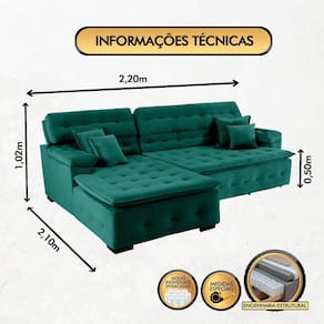 Altura aproximada: 102cm (quando reclinado) e 50cm (do chão ao assento).Largura aproximada: 220cm (esquerda/direita).Profundidade aproximada: 105cm (quando fechado) e 135cm (quando aberto).Profundidade da Chaise: 210cm (fixa).Capacidade de peso por assento: Aproximadamente 140kg.