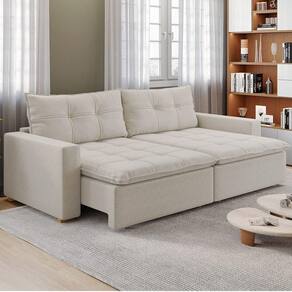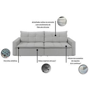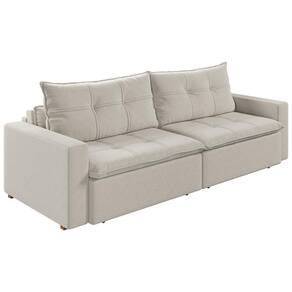 Material: O sofá possui estrutura em madeira de eucalipto reflorestada, assento retrátil com mecanismo metalico, espuma contínua D28 Supersoft sustentado por 4 molas de aço espirais e percinta sintética, encosto fixo com catraca em 3 estágios, almofadas com enchimento em fibra de silicone. O revestimento é em linho 100% poliéster, os módulos retráteis contam com rodinhas de silicone, os pés são de madeira e o acabamento é em costura prespontada com puxões no assento, unindo conforto, resistência e elegância.