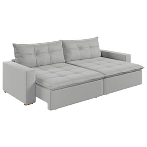 Material: O sofá possui estrutura em madeira de eucalipto reflorestada, assento retrátil com mecanismo metalico, espuma contínua D28 Supersoft sustentado por 4 molas de aço espirais e percinta sintética, encosto fixo com catraca em 3 estágios, almofadas com enchimento em fibra de silicone. O revestimento é em linho 100% poliéster, os módulos retráteis contam com rodinhas de silicone, os pés são de madeira e o acabamento é em costura prespontada com puxões no assento, unindo conforto, resistência e elegância.