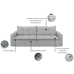 Material: O sofá possui estrutura em madeira de eucalipto reflorestada, assento retrátil com mecanismo metalico, espuma contínua D28 Supersoft sustentado por 4 molas de aço espirais e percinta sintética, encosto fixo com catraca em 3 estágios, almofadas com enchimento em fibra de silicone. O revestimento é em linho 100% poliéster, os módulos retráteis contam com rodinhas de silicone, os pés são de madeira e o acabamento é em costura prespontada com puxões no assento, unindo conforto, resistência e elegância.