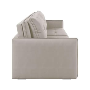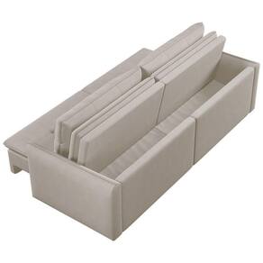 Material: O sofá possui estrutura em madeira de reflorestamento, assento retrátil com mecanismo metalico, pillow nos assentos com 16cm de espuma contínua D28 Supersoft sustentado por molas de aço, encosto reclinável em 3 posições, almofadas soltas com enchimento em fibra de silicone. O revestimento é em linho 100% poliéster, os módulos retráteis contam com rodinhas de silicone, os pés são de madeira, unindo conforto, resistência e elegância.