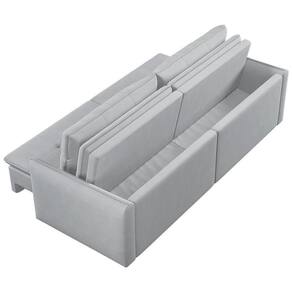 Material: O sofá possui estrutura em madeira de reflorestamento, assento retrátil com mecanismo metalico, pillow nos assentos com 16cm de espuma contínua D28 Supersoft sustentado por molas de aço, encosto reclinável em 3 posições, almofadas soltas com enchimento em fibra de silicone. O revestimento é em linho 100% poliéster, os módulos retráteis contam com rodinhas de silicone, os pés são de madeira, unindo conforto, resistência e elegância.