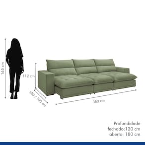 O sofá retrátil e reclinável Martinho de 350cm oferece o máximo conforto e versatilidade. Com design elegante e acabamento impecável, suas características diferenciadas incluem assentos retráteis para ajuste personalizado, encostos reclináveis para relaxamento total e materiais de alta qualidade que garantem durabilidade. Ideal para quem busca sofisticação e praticidade em um único produto, o Martinho se destaca pela sua funcionalidade e estilo, tornando-se o complemento perfeito para qualquer ambiente. Acompanha Almofadas extras: Não Almofada do assento: Fixa Almofada do encosto: Removível Altura do assento até o chão: 53 Altura do Encosto: 59 Altura dos Pés: 2.5 Ambiente Principal: Sala de Estar Complexidade da Montagem: Baixa: pode ser montado por uma pessoa sozinha Cor: Verde Cor do Produto: Verde Densidade do Assento: D-28 Densidade do Encosto: D-18 Enchimento do Assento: Espuma Enchimento do Encosto: Fibra Siliconada Estilo de Braço: Braços Quadrados Firmeza do Assento: Firme Itens Inclusos: 1 Sofá Linha ou Coleção: Martinho Material dos Pés: Madeira Necessita Montagem: Sim Origem do Produto: Nacional Peso: 133.9 Pet Friendly: Não Possui Baú: Não Possui Percintas Elásticas: Sim Possui Pés: 20 Possui Rodízio: Sim Profundidade Quando Estendido: 180 Quantidade de Itens: 1 Recomendações de Uso, Manutenção e Limpeza: Para limpar, utilize pano seco ou papel absorvente. Não armazenar em local úmido. Não usar produtos químicos como detergente, cloro, alvejantes entre outros. Evitar exposição a luz solar direta por longos períodos. Resistente à Chuva: Não Revestimento do Braço: Boucle Rodízio com Trava: Não Sistema de Montagem: Encaixe. Suporta Até (kg): 120 Tecido Predominante: Não Possui Tipo de Encosto: Regulável Tipo de Madeira Maciça da Estrutura: Eucalipto Tipo de Mola: Molas Ensacadas (Molas ensacadas) Marca: Celflex
