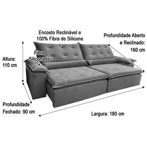 Sofá Retrátil Reclinável 1,80 m Cinza 502 Tijuca Plus Nosso Sofá Retrátil Reclinável Tijuca Plus é um produto autêntico, com design elegante que combina com qualquer ambiente e deixa sua sala ainda mais linda, aconchegante e moderna. MEDIDAS DO SOFÁ: Altura: 1.10 m Largura: 1.80 m Profundidade Sofá fechado: 90 cm Sofá aberto Reclinável da ponta da almofada até o encosto: 1.60 m Assento: O assento retrátil contem espuma AG 33 Fibra de silicone e percinta elástica que proporcionam uma acomodação extremamente confortável. Encosto: O encosto reclinável é feito com espuma 100% fibra de silicone. Além disso, as catracas são de ferro blindado com várias posições de inclinação, trazendo mais conforto para você na hora do descanso. Estrutura: Sua estrutura é com madeira de eucalipto, 100% reflorestada e seca em estufa, e os pés são produzidos em madeira e rodízio de silicone Revestimento: O revestimento é em tecido veludão, deixando a superfície do sofá muito mais macia. Braços: Braços com Fibra de silicone. * As imagens dos produtos são meramente ilustrativas. As cores podem sofrer variações dependendo da luminosidade, tipo de câmera ou mesmo da visualização das imagens em computadores, notebooks com telas LCD ou LED, tablets ou smartphones, dependendo da quantidade de pixels, podendo deixar as imagens com cores mais opacas ou cores mais vibrantes. Marca: Não Informado