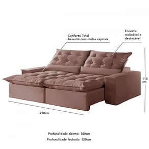Sofá Retrátil Reclinável 2.10 M Veludo Jolie Rose Montano Rose O Sofa Retratil Reclinavel da Montano traz elegancia e conforto para o seu ambiente. So de olhar ja da vontade de ter um igual, nao e? Nao perca tempo e garanta o seu!! Dimensoes: Altura: 118 cm | Largura: 210 cm | Profundidade Aberto: 180 cm | Profundidade Fechado: 120 cm
