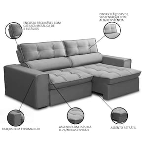 Muito mais versátil que o sofá tradicional, o sofá retrátil proporciona conforto e funcionalidade extra, já que você pode sentar, esticar as pernas e ainda deitar com espaço de sobra para assistir seu programa de favorito. Além disso, conta com uma estrutura robusta, tapeçaria em espuma de alta densidade e, ainda, revestimento em veludo suave e macio ao toque. Ahhh, e harmoniza facilmente com diversos estilos de decoração, graças às tonalidades sóbrias e atemporais. Em outras palavras, esse sofá 3 lugares será o ícone mais desejado na sua casa.