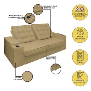 O sofá conta com assentos retráteis que se ajustam conforme sua necessidade, além de porta-copos e entrada USB integrados, permitindo que você aproveite suas bebidas e dispositivos eletrônicos sem se levantar. Seu tecido Suede proporciona toque macio, durabilidade e facilidade de limpeza, garantindo conforto e beleza todos os dias.