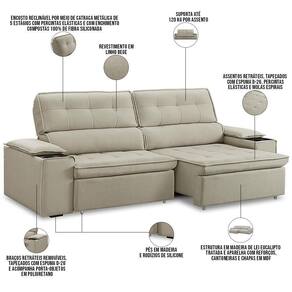 Altura: 110 cm | Color: Bege | ColorFamily: Bege | ColorSimple: Bege | ColorSupplier: Bege | Cor: Bege | Cor dos pés: Preto | Densidade da espuma do assento: D-26 | Desenho do tecido: Liso | Estilo: Moderno | Fabricante: Lyam Decor | Formato do sofá: Linear | Largura: 235 cm | Linha: Sala de Estar | Material: Madeira de Eucalipto, Cantoneiras, Chapas em MDF | Material de enchimento do encosto: Fibra Siliconada | Material do estofamento: Linho | MaterialFamily: Madeira de Eucalipto | Mecanismo de abertura do produto: Retrátil em tubo, rodízios de silicone | Model: Bilac | Orientação do Sofá: Linear | OriginCountry: Brasil | OriginState: PR | Peso: 70 kg | Peso máximo suportado: 240 kg | ProductContents: 01 Sofá | ProductHeight: 110 cm | ProductInstructions: Produto para uso em ambiente interno, nao devendo ficar exposto ao sol, calor e umidade excessivos. | ProductLength: 98 cm | ProductWarranty: 90 dias após o recebimento do produto | ProductWeight: 70 kg | ProductWidth: 235 cm | Profundidade: 98 cm | Quantidade de Caixas de embalagem: 1 | Requer montagem: Não | SizeDescription: Altura: 110 cm x Largura: 235 cm x Profundidade: 98 cm | SupplierSimpleName: Sofá Retrátil Reclinável 3 Lugares Sala de Estar 235cm Bilac F04 Linho Bege - Lyam Decor | Tipo de produto: Sofá Retrátil Reclinável | Unidades por kit: na
