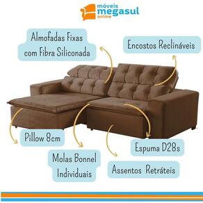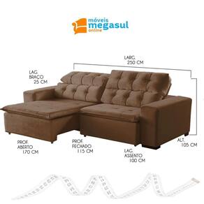Ao chegar em casa nada melhor que o aconchego de um sofá extravagante em conforto, por isso conte com o Sofá 5 Lugares Retrátil e Reclinável Alasca 2,50m na cor Marrom, fabricado pela MegaSul, possui encosto reclinável, com catraca silenciosa 5 estágios, almofadas fixas de fibra siliconada. Perfeito para seus momentos de descanso e descontração! Valorize e complete o seu lar com muita beleza e funcionalidade! Aproveite e experimente o novo! O tecido veludo é de alto padrão, depois da seda, é um dos tecidos mais nobres. Possui textura ricamente macia e suave, associado a classe e elegância com a proposta de sensação ao toque mais sensível e encantador. Além de trazer sofisticação para o produto, ter variações de cores extremamente modernas, que agregam na decoração do seu ambiente, com o ar de sofisticação, mais decorativo. Estrutura do Sofá 5 Lugares Retrátil e Reclinável Alasca é eucalipto tratado de reflorestamento ecologicamente correto. O assento é retrátil, pillow, espuma D-28, revestido com manta fibra siliconada, contém molas individuais bonnel, corrediça metálica e percinta elástica. Dados Técnicos do Sofá 5 Lugares Retrátil e Reclinável Alasca: Largura: 2,50m Altura: 1,05m Profundidade com assento fechado: 1,15m Profundidade com assento aberto: 1,70m Cor: Marrom 512 OBS: Estofado disponível em mais de 10 cores em tecido veludo de alta qualidade. * Para escolher outra a cor, informe o código nas observações adicionais ao finalizar a compra. Caso tenha alguma dúvida, ou não consiga escolher a cor durante a compra, Após a compra nosso atendimento entrará em contato com você para confirmar a COR e o TECIDO, fique tranquila (o). Tecido/Revestimento: Veludo Informações Adicionais: Garantia de 90 dias para defeitos de fabricação; Limpeza ou Manutenção: Utilizar escova com cerdas macias. NÃO utilizar produtos Abrasivos. Tecido/Revestimento: Veludo Montagem e instalação por conta do comprador; As imagens ambientadas são meramente ilustrativas e podem apresentar itens que não compõe o produto; As cores do produto podem variar de acordo com o monitor, a iluminação do ambiente ou sua percepção visual. Informações sobre a entrega: VERIFIQUE as MEDIDAS para garantir que o sofá passe na porta e nos corredores de sua residência; NÃO NOS RESPONSABILIZAMOS por SUBIR o sofá por ESCADAS, NEM IÇAR o sofá;