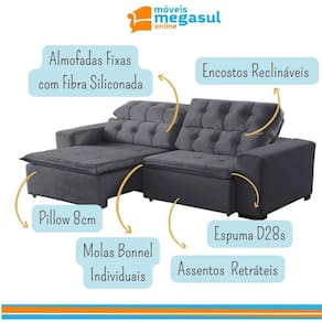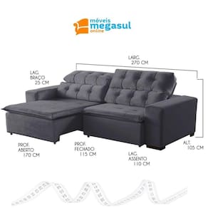 Ao chegar em casa nada melhor que o aconchego de um sofá extravagante em conforto, por isso conte com o Sofá 5 Lugares Retrátil e Reclinável Alasca 2,70m na cor Marrom, fabricado pela MegaSul, possui encosto reclinável, com catraca silenciosa 5 estágios, almofadas fixas de fibra siliconada. Perfeito para seus momentos de descanso e descontração! Valorize e complete o seu lar com muita beleza e funcionalidade! Aproveite e experimente o novo! O tecido veludo é de alto padrão, depois da seda, é um dos tecidos mais nobres. Possui textura ricamente macia e suave, associado a classe e elegância com a proposta de sensação ao toque mais sensível e encantador. Além de trazer sofisticação para o produto, ter variações de cores extremamente modernas, que agregam na decoração do seu ambiente, com o ar de sofisticação, mais decorativo. Estrutura do Sofá 5 Lugares Retrátil e Reclinável Alasca é eucalipto tratado de reflorestamento ecologicamente correto. O assento é retrátil, pillow, espuma D-28, revestido com manta fibra siliconada, contém molas individuais bonnel, corrediça metálica e percinta elástica. Dados Técnicos do Sofá 5 Lugares Retrátil e Reclinável Alasca: Largura: 2,70m Altura: 1,05m  Profundidade com assento fechado: 1,15m Profundidade com assento aberto: 1,70m Cor: Cinza OBS: Estofado disponível em 8 cores em tecido veludo de alta qualidade. * Para escolher outra a cor, informe o código nas observações adicionais ao finalizar a compra. Tecido/Revestimento: Veludo   Informações Adicionais: Garantia de 90 dias para defeitos de fabricação; Limpeza ou Manutenção: Utilizar escova com cerdas macias. NÃO utilizar produtos Abrasivos. Tecido/Revestimento: Veludo Montagem e instalação por conta do comprador; As imagens ambientadas são meramente ilustrativas e podem apresentar itens que não compõe o produto; As cores do produto podem variar de acordo com o monitor, a iluminação do ambiente ou sua percepção visual.
