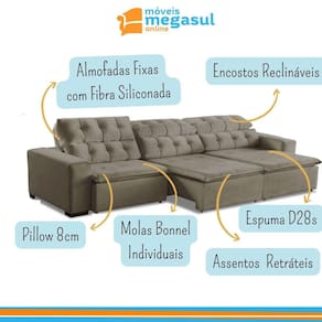Ao chegar em casa nada melhor que o aconchego de um sofá extravagante em conforto, por isso conte com o Sofá 07 Lugares Retrátil e Reclinável Alasca 3,50 m na cor Bege, fabricado pela MegaSul, possui encosto reclinável, com catraca silenciosa 5 estágios, almofadas fixas de fibra siliconada. Perfeito para seus momentos de descanso e descontração! Valorize e complete o seu lar com muita beleza e funcionalidade! Aproveite e experimente o novo! O tecido veludo é de alto padrão, depois da seda, é um dos tecidos mais nobres. Possui textura ricamente macia e suave, associado a classe e elegância com a proposta de sensação ao toque mais sensível e encantador. Além de trazer sofisticação para o produto, ter variações de cores extremamente modernas, que agregam na decoração do seu ambiente, com o ar de sofisticação, mais decorativo. Estrutura do Sofá 07 Lugares Retrátil e Reclinável Alasca é eucalipto tratado de reflorestamento ecologicamente correto. O assento é retrátil, pillow, espuma D-28, revestido com manta fibra siliconada, contém molas individuais bonnel, corrediça metálica e percinta elástica. Dados Técnicos do Sofá 4 Lugares Retrátil e Reclinável Alasca: Largura:3,50 m Altura: 1,05m Profundidade com assento fechado: 1,15m Profundidade com assento aberto: 1,70m 3 Módulos de 100 CM Braços de 25 cm cada Cor: Bege? 526 OBS: Estofado disponível em mais de 10 cores em tecido veludo de alta qualidade. * Para escolher outra a cor, informe o código nas observações adicionais ao finalizar a compra. Caso tenha alguma dúvida, ou não consiga escolher a cor durante a compra, Após a compra nosso atendimento entrará em contato com você para confirmar a COR e o TECIDO, fique tranquila (o). Informações Adicionais: Garantia de 90 dias para defeitos de fabricação; Limpeza ou Manutenção: Utilizar escova com cerdas macias. NÃO utilizar produtos Abrasivos. Tecido/Revestimento: Veludo Montagem e instalação por conta do comprador; As imagens ambientadas são meramente ilustrativas e podem apresentar itens que não compõe o produto; As cores do produto podem variar de acordo com o monitor, a iluminação do ambiente ou sua percepção visual. Informações sobre a entrega: VERIFIQUE as MEDIDAS para garantir que o sofá passe na porta e nos corredores de sua residência; NÃO NOS RESPONSABILIZAMOS por SUBIR o sofá por ESCADAS, NEM IÇAR o sofá;