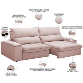 Altura: 115 cm | Color: Rosa | ColorFamily: Rosa | ColorSimple: Rosa | ColorSupplier: Rosê | Cor: Rosê | Cor dos pés: -1 | Densidade da espuma do assento: D-26 | Desenho do tecido: Liso | Estilo: Moderno | Fabricante: Lyam Decor | Formato do sofá: Linear | Largura: 280 cm | Linha: Sala de Estar, Living | Material: Madeira de lei (Eucalipto) devidamente tratada e aparelhada com reforços e cantoneiras e chapas em M | Material de enchimento do encosto: 100% de Fibra Siliconada | Material do estofamento: Veludo | MaterialFamily: Tecido, Madeira | Mecanismo de abertura do produto: -1 | Model: Nápoles | Orientação do Sofá: -1 | OriginCountry: Nacional | OriginState: PR | Peso: 110 kg | Peso máximo suportado: 100 kg | ProductContents: 01 Sofá | ProductHeight: 280 cm | ProductInstructions: Produto para uso em ambiente interno, nao devendo ficar exposto ao sol, calor e umidade excessivos. | ProductLength: 110 cm | ProductWarranty: 90 dias após o recebimento do produto | ProductWeight: 110 kg | ProductWidth: 115 cm | Profundidade: 110 cm | Quantidade de Caixas de embalagem: 1 | Requer montagem: Não | SizeDescription: Altura: 115 cm x Largura: 280 cm x Profundidade: 96 cm | SupplierSimpleName: Sofá Retrátil Reclinável Para Sala de Estar Living 280cm Nápoles F04 Veludo Rosê - Lyam Decor | Tipo de produto: Sofá | Unidades por kit: 1