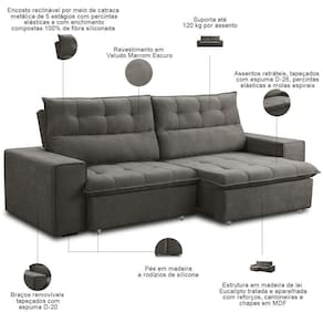 Unidades por kit: 1 | Cor: Marrom Escuro | Requer montagem: Não | Altura: 110 cm | Tipo de produto: Sofá Retrátil Reclinável | Peso máximo suportado: 240 kg | Peso: 70 kg | Orientação do Sofá: Frontal | Mecanismo de abertura do produto: Manual, rodízios de silicone | Material do estofamento: Veludo | Material de enchimento do encosto: Fibra Siliconada | Linha: Sala de Estar | Formato do sofá: Linear | Estilo: Moderno | Desenho do tecido: Liso | Fabricante: Lyam Decor | Cor dos pés: Marrom | Profundidade: 98 cm | Largura: 220 cm | Quantidade de Caixas de embalagem: 1 | Densidade da espuma do assento: D-26