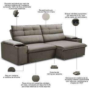 Unidades por kit: 1 | Cor: Marrom Claro | Requer montagem: Não | Tipo de produto: Sofá Retrátil Reclinável | Altura: 110 cm | Peso máximo suportado: 240 kg | Peso: 70 kg | Orientação do Sofá: Frontal | Mecanismo de abertura do produto: Manual, rodízios de silicone | Material do estofamento: Veludo | Material de enchimento do encosto: Fibra Siliconada | Linha: Sala de Estar | Formato do sofá: Linear | Estilo: Moderno | Fabricante: Lyam Decor | Desenho do tecido: Liso | Densidade da espuma do assento: D-26 | Largura: 225 cm | Cor dos pés: Marrom | Profundidade: 98 cm | Quantidade de Caixas de embalagem: 1