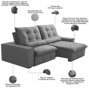 Unidades por kit: 1 | Requer montagem: Não | Tipo de produto: Sofá Retrátil Reclinável | Mecanismo de abertura do produto: Manual, rodízios de silicone | Estilo: Moderno | Profundidade: 121 cm | Cor: Cinza claro | Peso máximo suportado: 240 kg | Material de enchimento do encosto: Fibra Siliconada | Fabricante: Lyam Decor | Quantidade de Caixas de embalagem: 1 | Largura: 230 cm | Desenho do tecido: Liso | Orientação do Sofá: Frontal | Altura: 115 cm | Densidade da espuma do assento: D-26 | Cor dos pés: Marrom | Peso: 80 Kg | Material do estofamento: Veludo | Linha: Sala de Estar | Formato do sofá: Linear