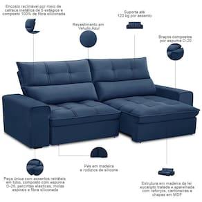 Cor: Azul | Unidades por kit: 1 | Requer montagem: Não | Tipo de produto: Sofá Retrátil Reclinável | Altura: 110 cm | Peso máximo suportado: 240 kg | Peso: 85 kg | Orientação do Sofá: Frontal | Mecanismo de abertura do produto: Manual, rodízios de silicone | Material do estofamento: Veludo | Material de enchimento do encosto: Fibra Siliconada | Linha: Sala de Estar | Formato do sofá: Linear | Estilo: Moderno | Fabricante: Lyam Decor | Desenho do tecido: Liso | Densidade da espuma do assento: D-26 | Largura: 250 cm | Cor dos pés: Marrom | Profundidade: 95 cm | Quantidade de Caixas de embalagem: 1