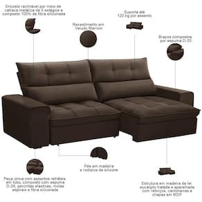 Requer montagem: Não | Tipo de produto: Sofá Retrátil Reclinável | Quantidade de Caixas de embalagem: 1 | Peso máximo suportado: 240 kg | Fabricante: Lyam Decor | Profundidade: 95 cm | Unidades por kit: 1 | Formato do sofá: Linear | Altura: 110 cm | Material de enchimento do encosto: Fibra Siliconada | Desenho do tecido: Liso | Estilo: Moderno | Linha: Sala de Estar | Densidade da espuma do assento: D-26 | Orientação do Sofá: Frontal | Largura: 250 cm | Cor: Marrom | Peso: 85 kg | Material do estofamento: Veludo | Mecanismo de abertura do produto: Manual, rodízios de silicone | Cor dos pés: Marrom