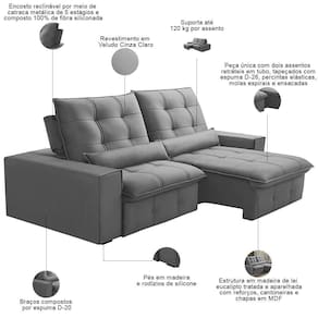 Cor: Cinza claro | Requer montagem: Não | Altura: 115 cm | Peso máximo suportado: 240 kg | Peso: 90 kg | Orientação do Sofá: Frontal | Mecanismo de abertura do produto: Manual, rodízios de silicone | Material do estofamento: Veludo | Formato do sofá: Linear | Estilo: Moderno | Densidade da espuma do assento: D-26 | Tipo de produto: Sofá Retrátil Reclinável | Profundidade: 121 cm | Desenho do tecido: Liso | Material de enchimento do encosto: Fibra Siliconada | Quantidade de Caixas de embalagem: 1 | Unidades por kit: 1 | Largura: 250 cm | Cor dos pés: Marrom | Fabricante: Lyam Decor | Linha: Sala de Estar