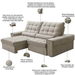 Formato do sofá: Linear | Estilo: Moderno | Orientação do Sofá: Frontal | Material do estofamento: Veludo | Peso: 90 kg | Material de enchimento do encosto: Fibra Siliconada | Desenho do tecido: Liso | Unidades por kit: 1 | Cor: Bege | Peso máximo suportado: 240 kg | Linha: Sala de Estar | Densidade da espuma do assento: D-26 | Quantidade de Caixas de embalagem: 1 | Requer montagem: Não | Mecanismo de abertura do produto: Manual, rodízios de silicone | Profundidade: 121 cm | Largura: 250 cm | Altura: 115 cm | Tipo de produto: Sofá Retrátil Reclinável | Cor dos pés: Marrom | Fabricante: Lyam Decor
